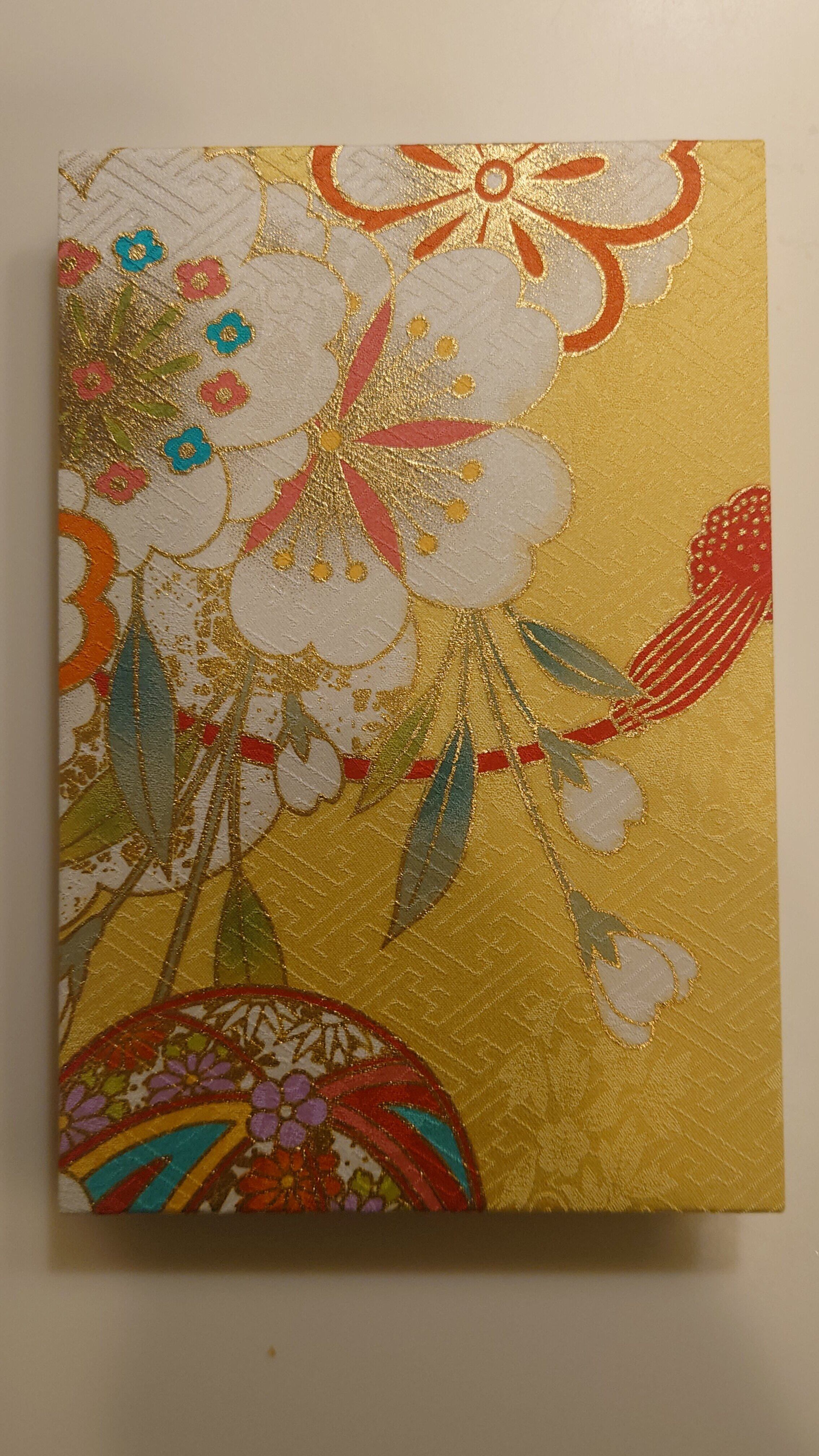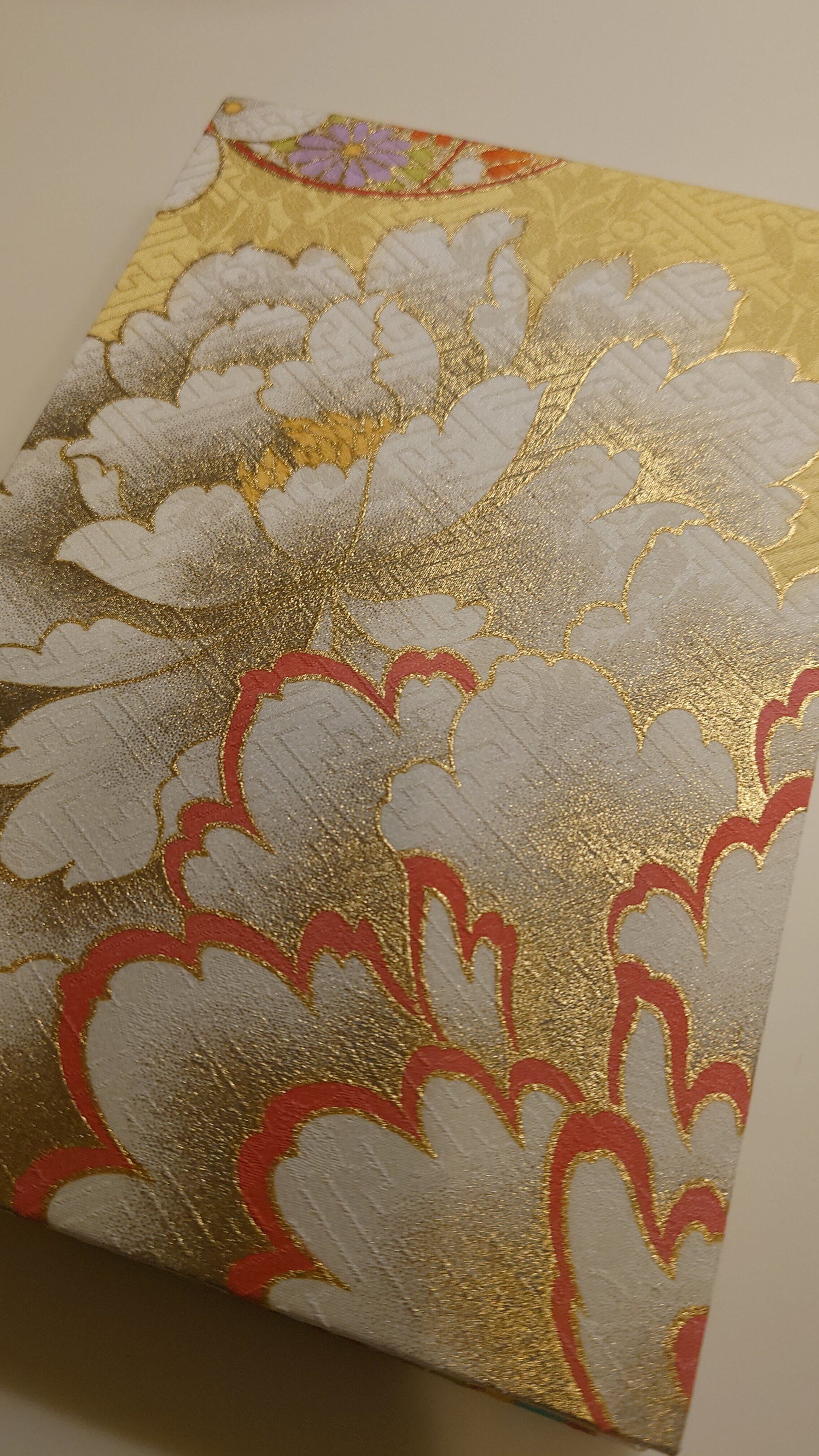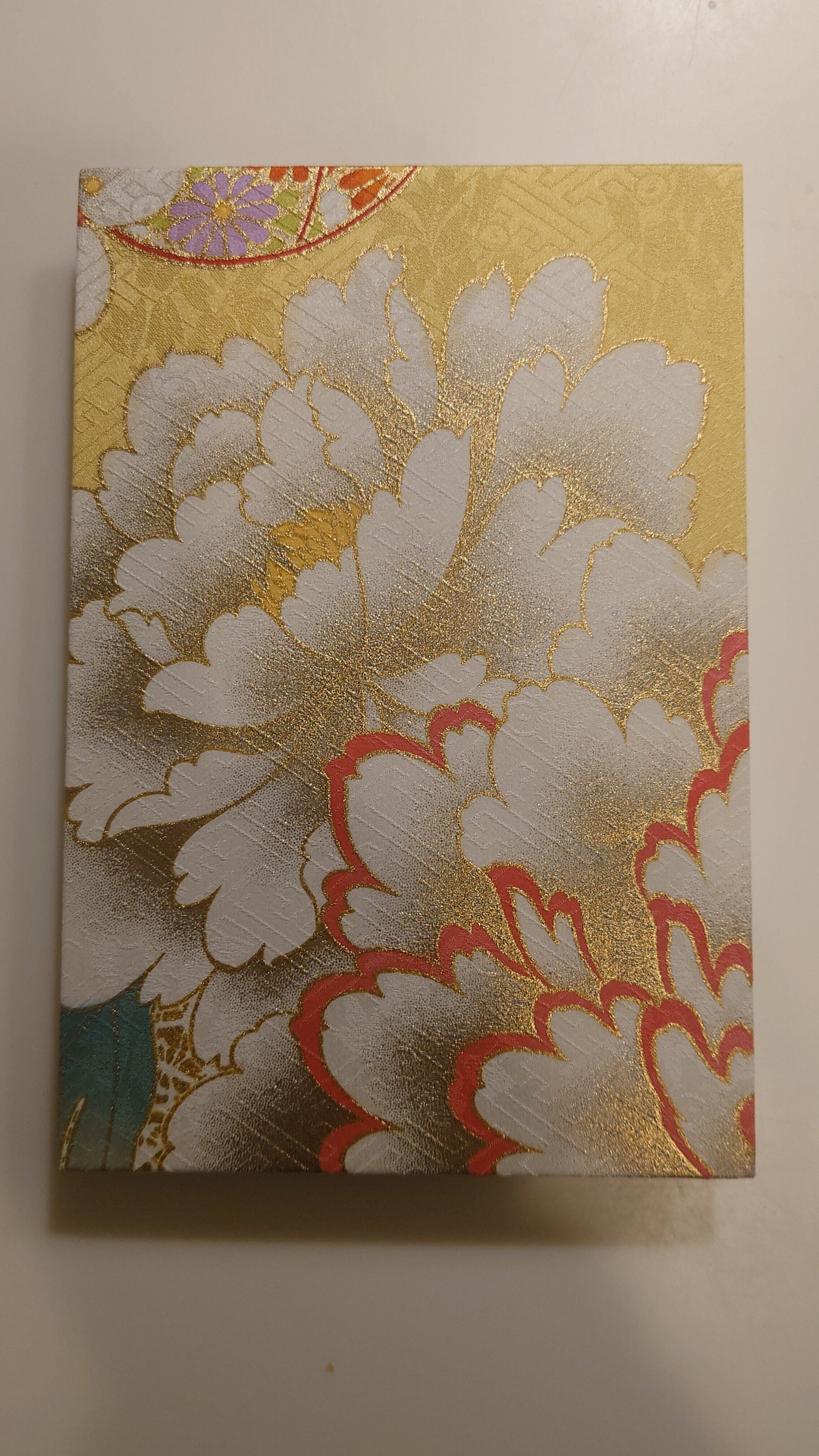 京友禅の中でも振袖の生地を使用しています。振袖は華やかでたくさんの色を使用しています。御朱印帳としてだけでなくインテリアとして飾ってもおしゃれです。