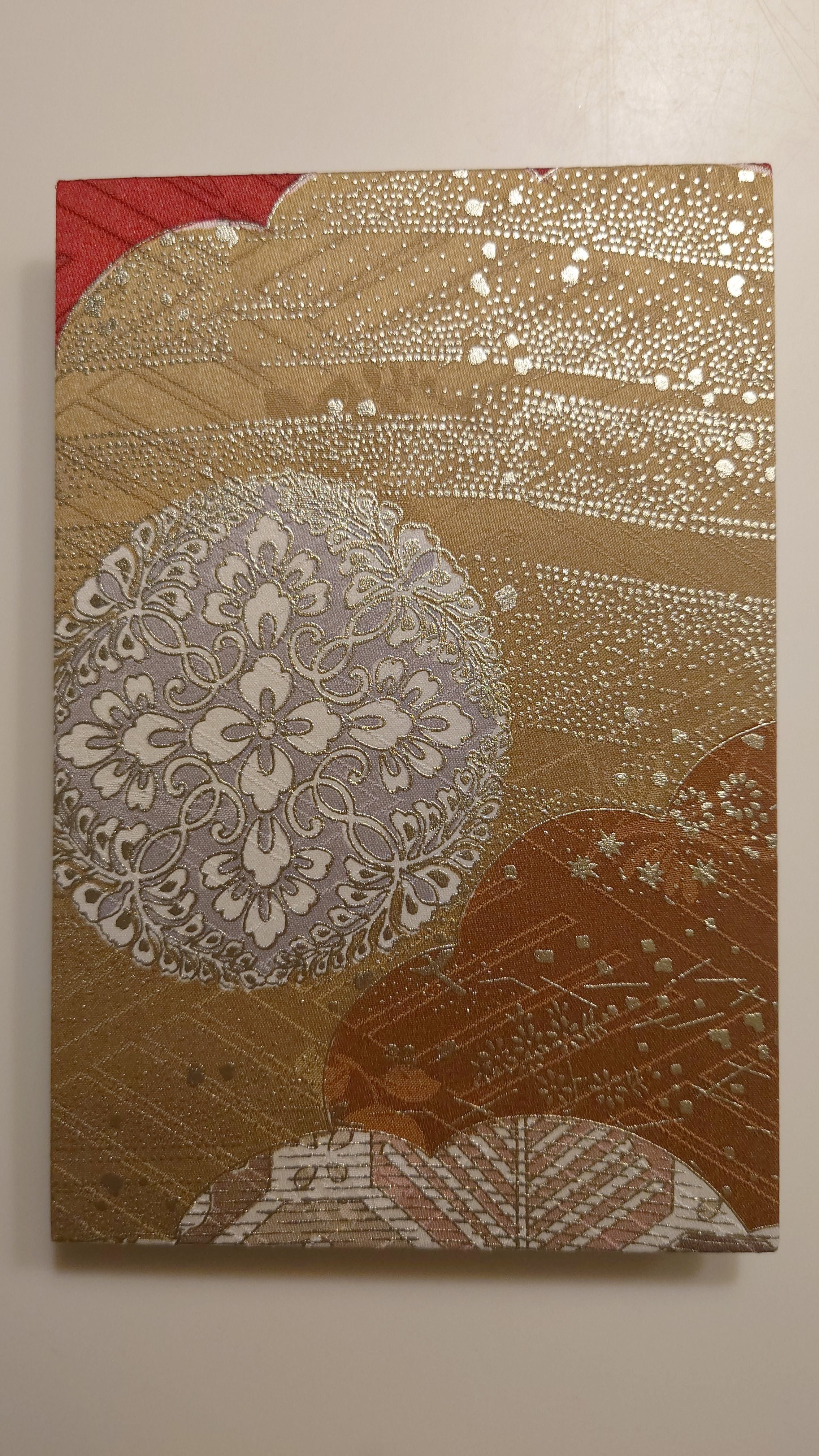 京友禅の中でも振袖の生地を使用しています。振袖は華やかでたくさんの色を使用しています。御朱印帳としてだけでなくインテリアとして飾ってもおしゃれです。